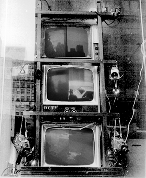 New York and Los Angeles, 1981-2 In a storefront window is built a rack supporting three tiers of monitors and three pairs of cameras. The cameras are mounted on oscillators, which cause them to pan the street outside the window in 90-degree sweeps. The monitors' screens are split, so each half represents the input of one camera. The cameras mounted on the bott om tier pan the sidewalk: the right camera scans from far right to center a back again, while the left camera sweeps from far left to center and back. The images converge at the center, where pedestrians' feet are engulfed by the sidewalk. The middle t ier represents the level of the storefronts on the opposite side of the street, and the top tier shows the sweep from earth to skyscrapers' tops to earth to sky. Inside the gallery, one monitor with a six-way split represented the amalgamation of all six views.