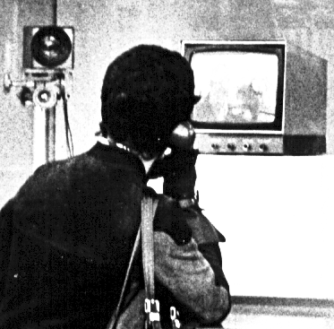 London, Manchester, and Santa Monica, 1977 Sobell placed a telephone on the ledge outside the gallery window; she sat inside, facing away from the window at an oblique angle, with another telephone. A closed-circuit camera was trained on her face, and another on the faces of the public as they ap proached the phone. Split-screen monitors faced her and the public, with one side of the screen devoted to her image, the other to the other participant. By picking up the telephone on the ledge, participants could talk to her, and could see her face on the monitor.
